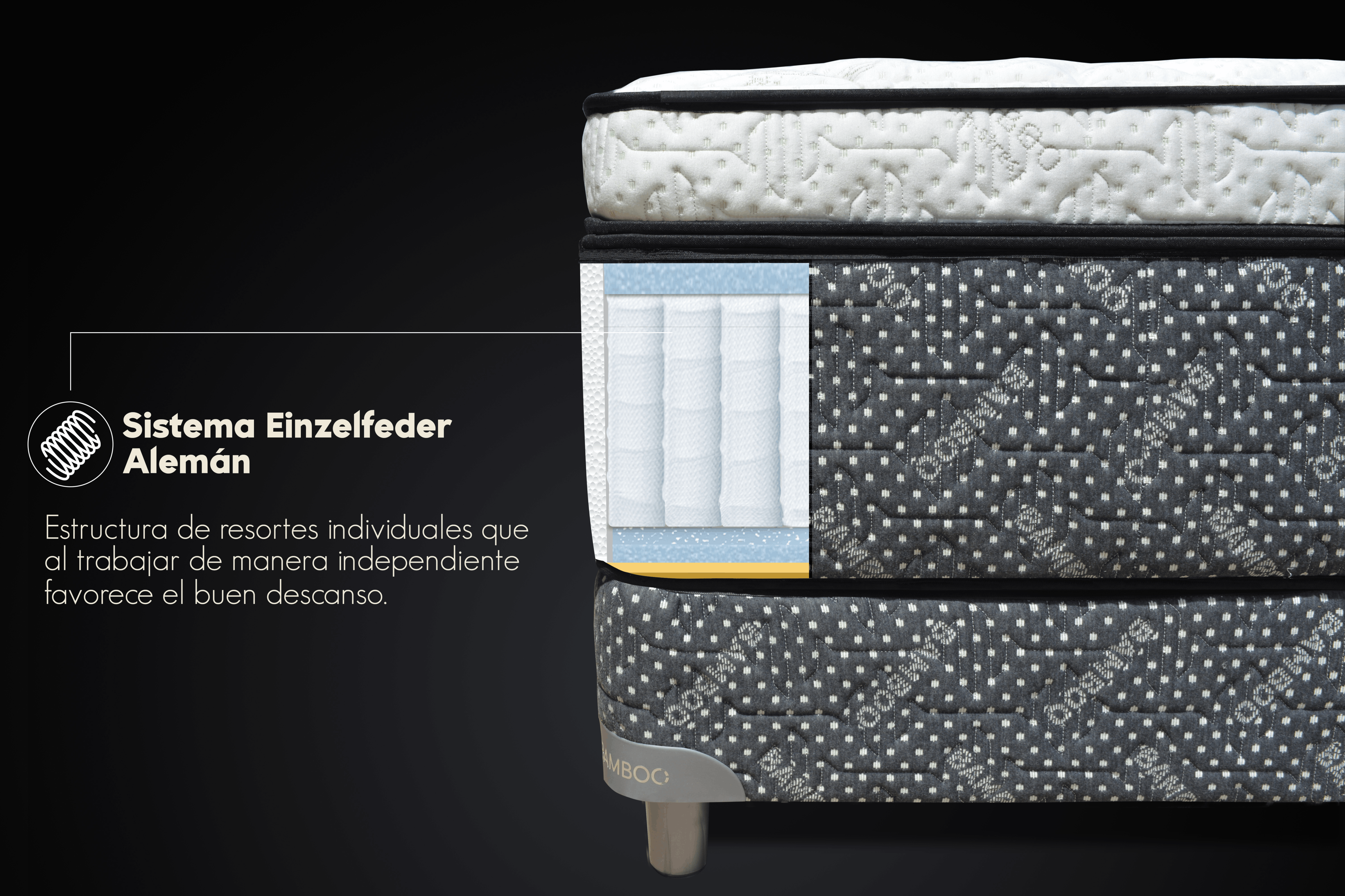 – Estructura de resortes alemanes pocket Eizenfelder con 17 cm de altura, enfundados individualmente. Cada resorte se adapta a la presión y los movimientos sin alterar la estructura total.